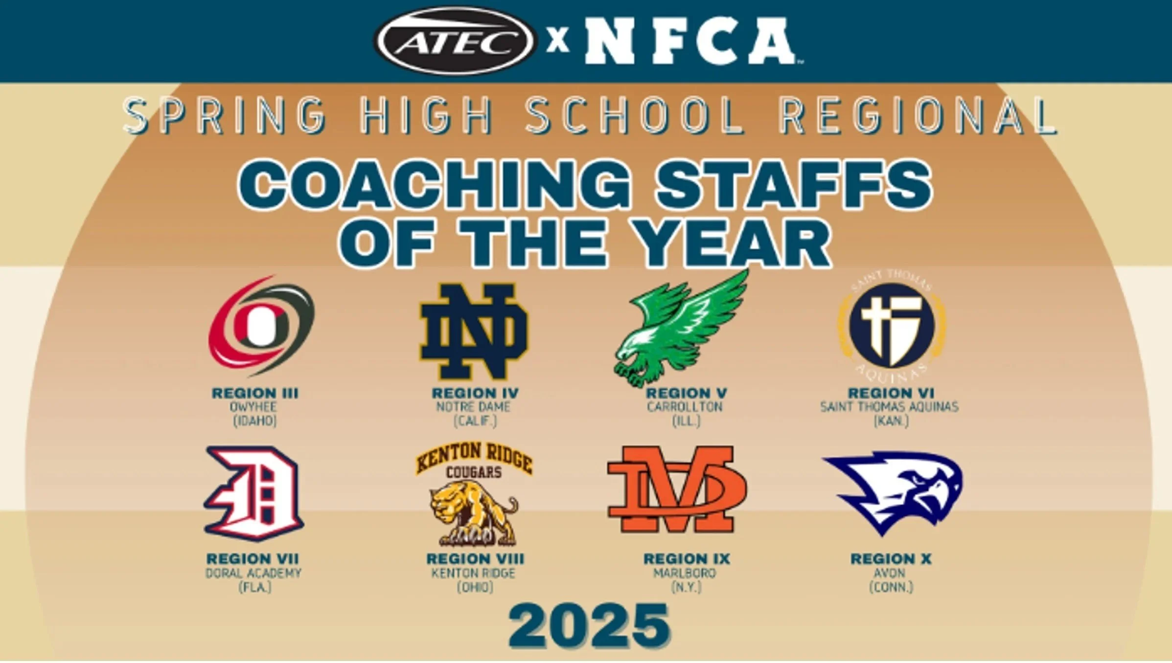 LOUISVILLE, Ky. – Eight schools were selected by their peers as the 2025 ATEC/NFCA Spring High School Regional Coaching Staff of the Year honorees, the Association announced on Friday afternoon.